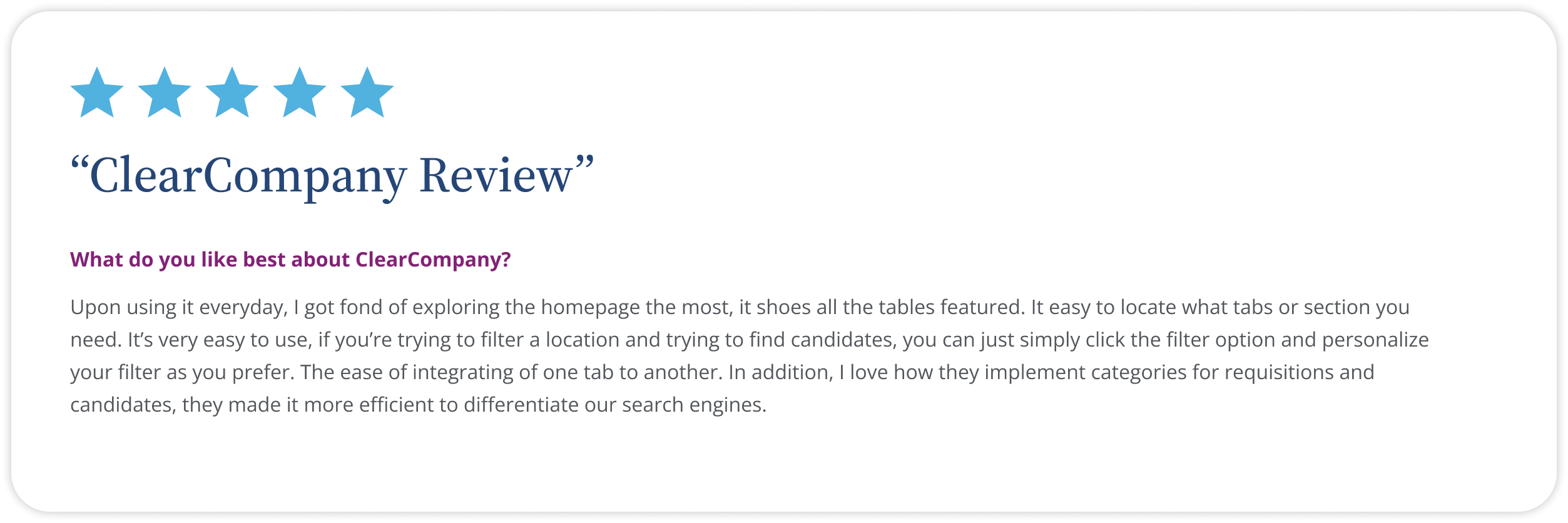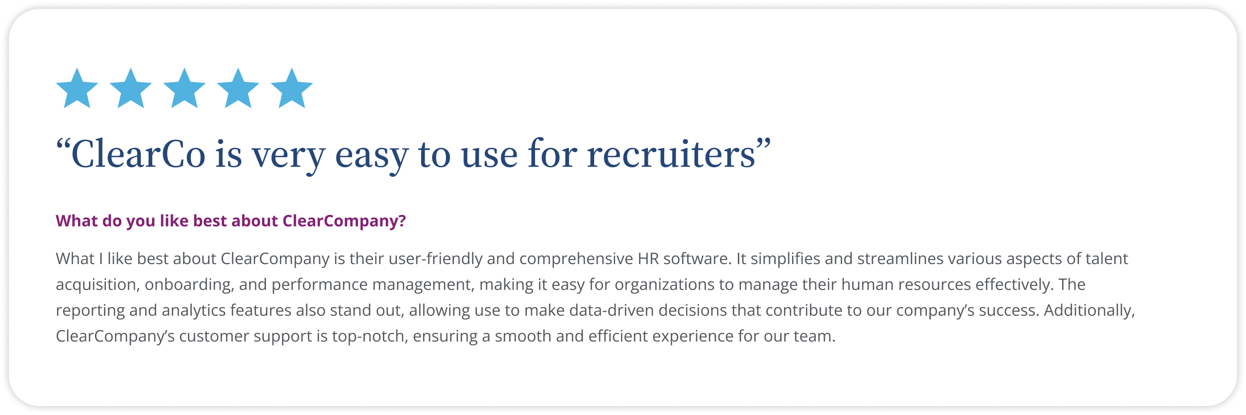 Your search for just about anything in life, from new shoes to a new job, includes getting feedback from people who’ve actually worn them or worked there. Choosing new software should include the same process of vetting reviews for real user experiences. Take a look at why ClearCompany ATS is the clear choice for our clients.